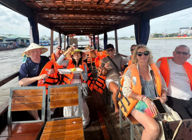 12:00 PM: Break for a traditional Vietnamese lunch at a local restaurant. Mekong Delta Adventure: Head to My Tho, the heart of the Mekong Delta, and board a boat for a scenic river cruise. Pass by the four animal-named islands: Dragon, Unicorn, Phoenix, and Turtle. Witness the daily life of riverside locals as you cruise the Mekong. Explore smaller waterways through lush fruit orchards, coconut groves, and bee-keeping farms. Taste honey tea, seasonal fruits, and coconut candy while enjoying a live Southern Vietnamese folk music performance.
